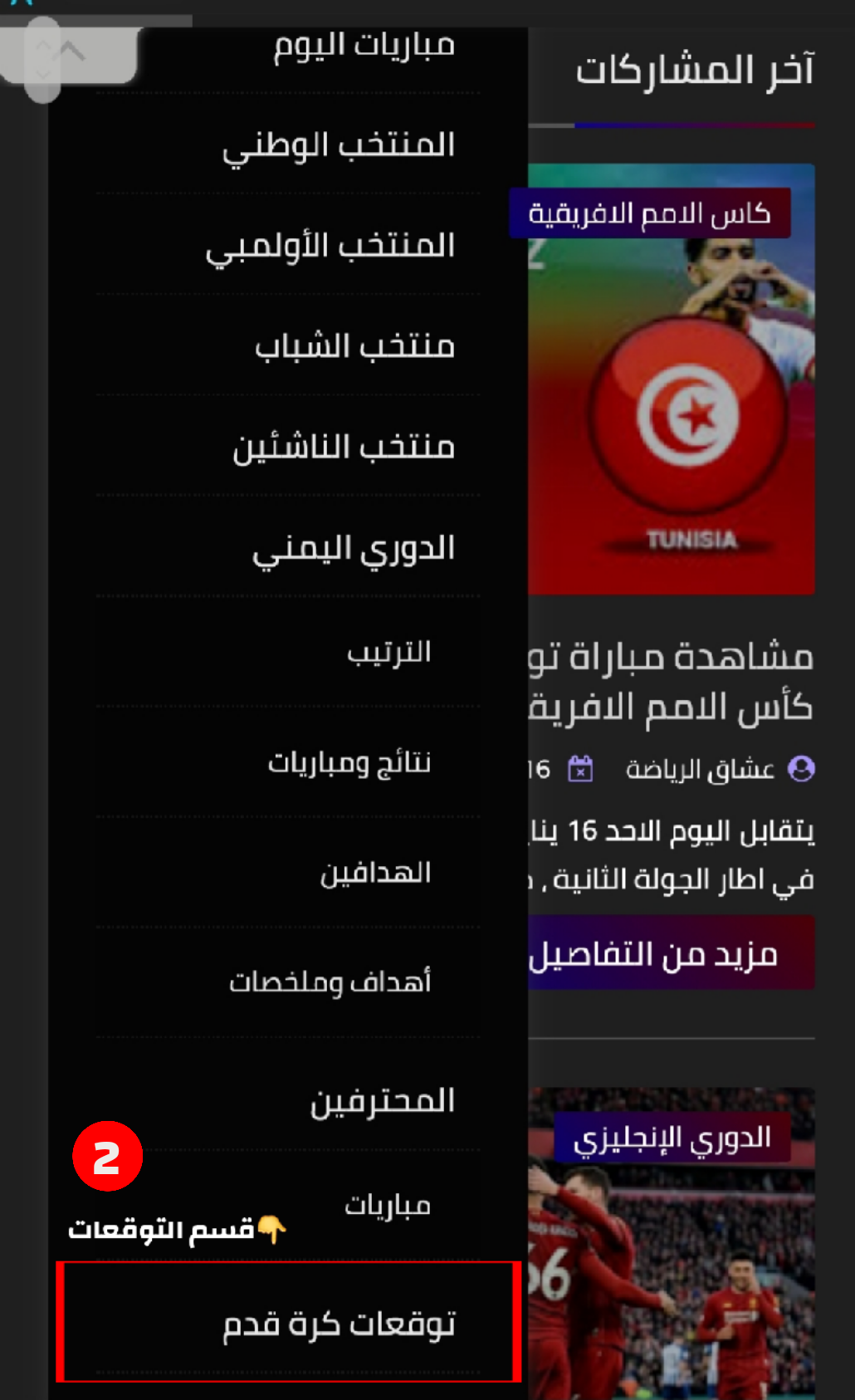 الطريقة الثانية ستجد اقسام الموقع على جهة اليسار انقر على الاقسام سيظهر لك قسم توقعات كرة القدم ادخل علية وستظهر لك المباريات التي يجب عليك التوقع عليها.